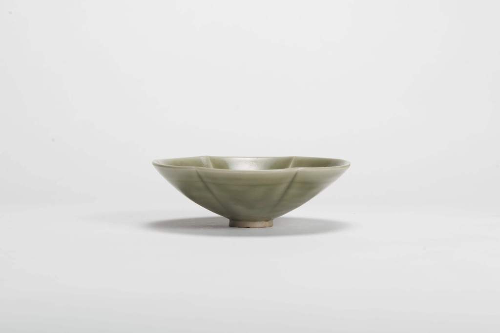 盞作六瓣花形,斜璧,小圈足,器形源自宋代金銀器,花瓣轉折處呈出筋狀,器形、線條富有張力,造型優美,俯視或仰視猶如一朵盛開的六出梔子花。通體施青釉,釉面瑩潤,釉色淡雅。