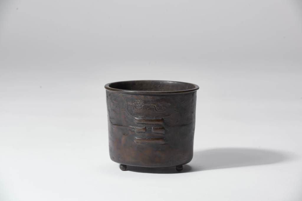 桶形器身,上寬下斂,下壁貼三小球足。口緣唇板內伸,外壁岩下刻各一圈雷紋,腹中段為八卦紋,全器深沈有變化。