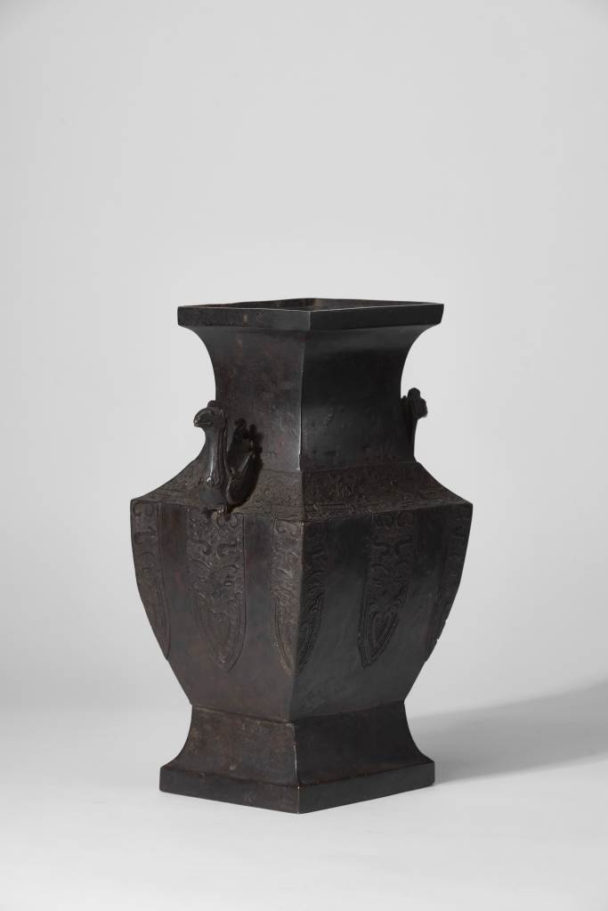 方壺通體以銅為材料,方口,頸部收縮,方腹弧壁,方圈足,頸上部飾夔龍紋,刻畫精准,仿自於西周時期的經典紋飾,其下鏨刻寬大的焦葉紋,內部以緊密的回紋作地,頸部兩側鑄飾對稱的鳳耳,躬身軀體,回首張望,紋飾精美,製作精緻,整器造型規整,工藝技法繁復精湛,皮色自然,包漿淳厚。