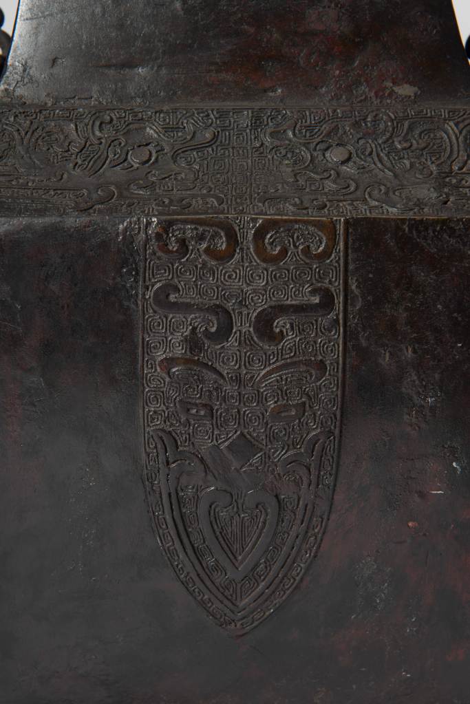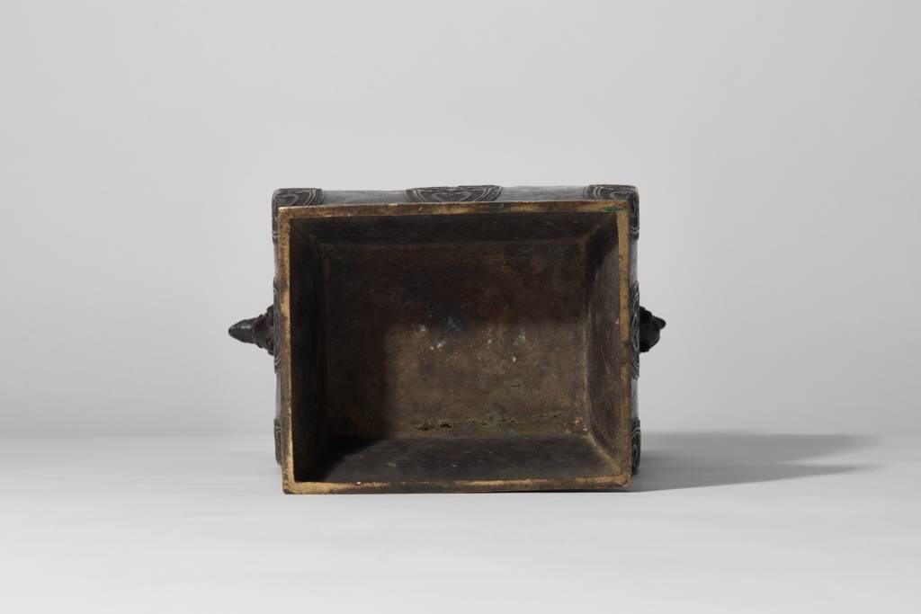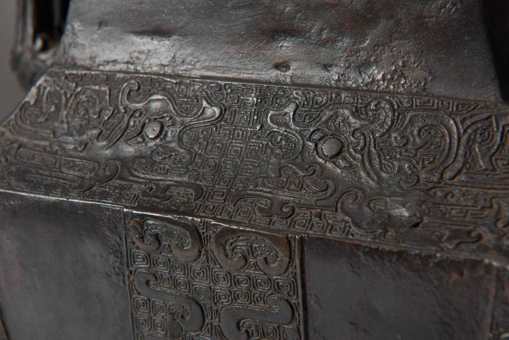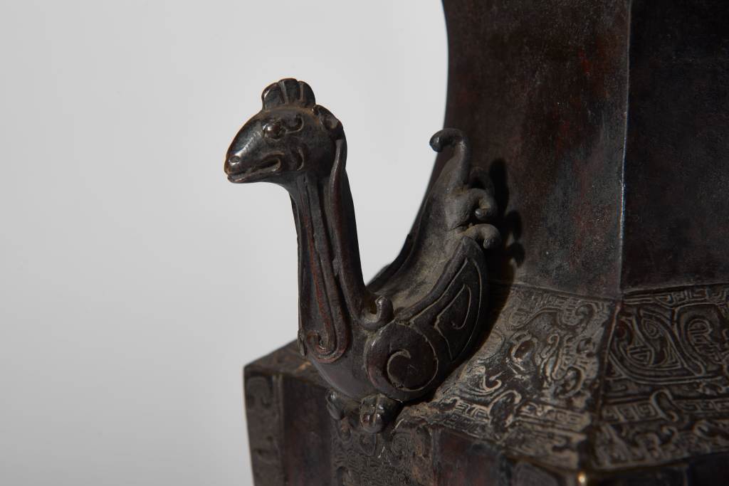 The interior is made of dense 回紋 patterns, and symmetrical phoenix ears are cast on both sides of the neck. The phoenix is bowed and looking back. This ware’s decoration is exquisite, showing delicate craftsmanship