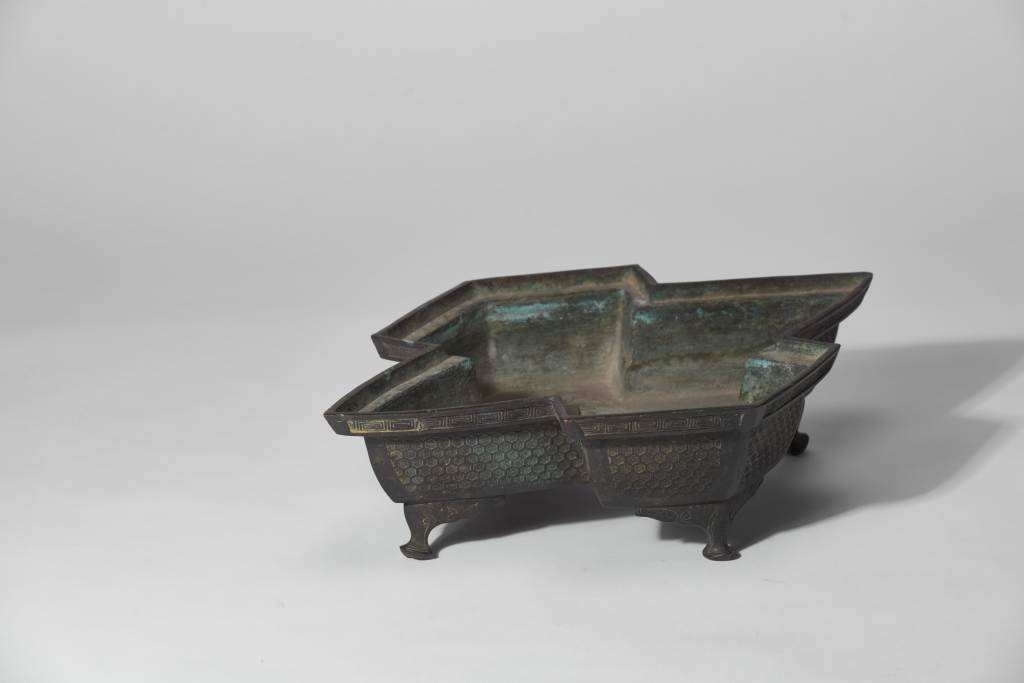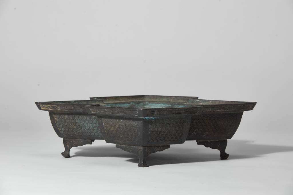 菱形盆、深壁,平底凸出窄邊稜,四雲頭形足,口部飾有回文,器身飾龜甲紋,整體立體有型,造型特殊,為明代文人所使用之花器,傳至日本後被用作花道使用器的經典器型之一。