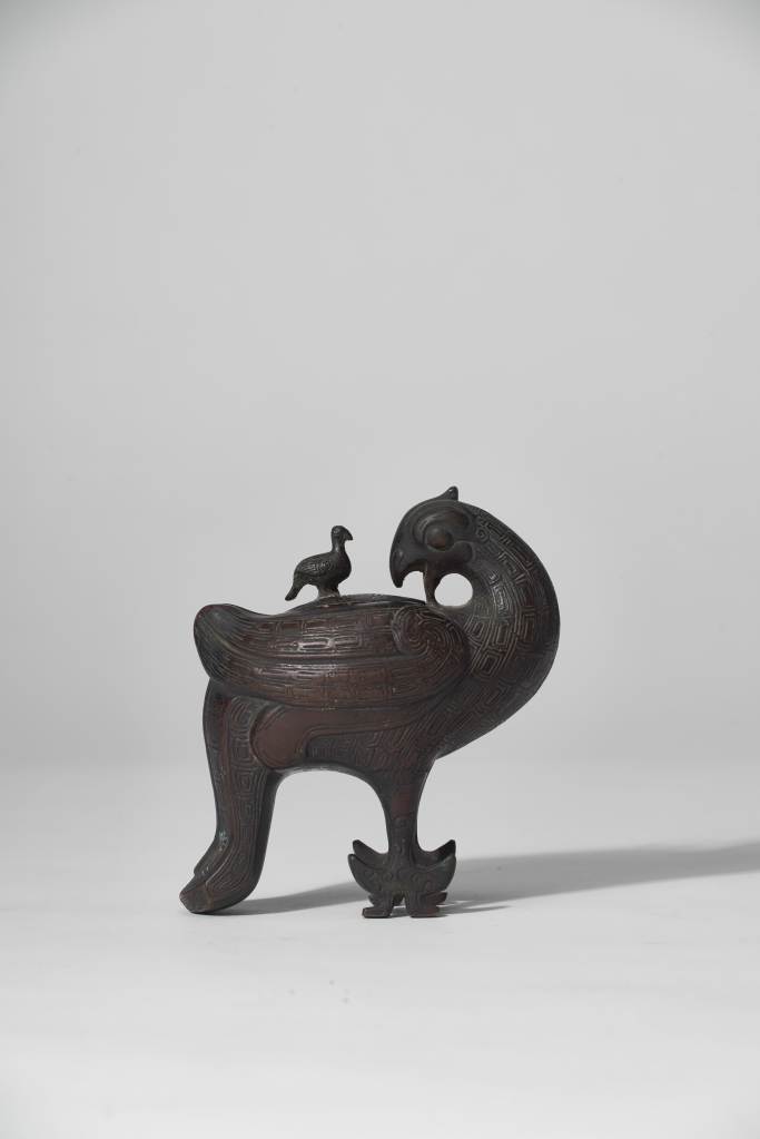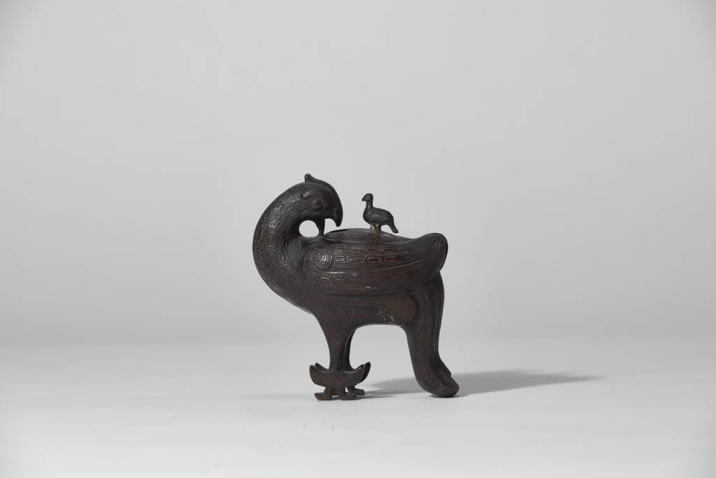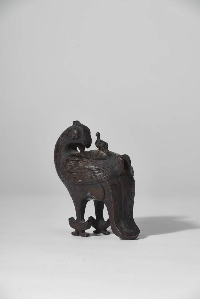 《周禮》曾記載周代宗廟禮器有“六尊六彝”,“鳥尊”即是其一,整件器物以昂然直立的大鳥回眸為主體造型,大鳥頭部微微上昂,雙眼圓睜,高冠直立,體形豐滿。大鳥的尾部下彎,形成器物的第三支點。在鳥尊背上,一隻小鳥靜靜相依,成為鳥尊器蓋上的捉手,為明代文人好古風氣的體現。
