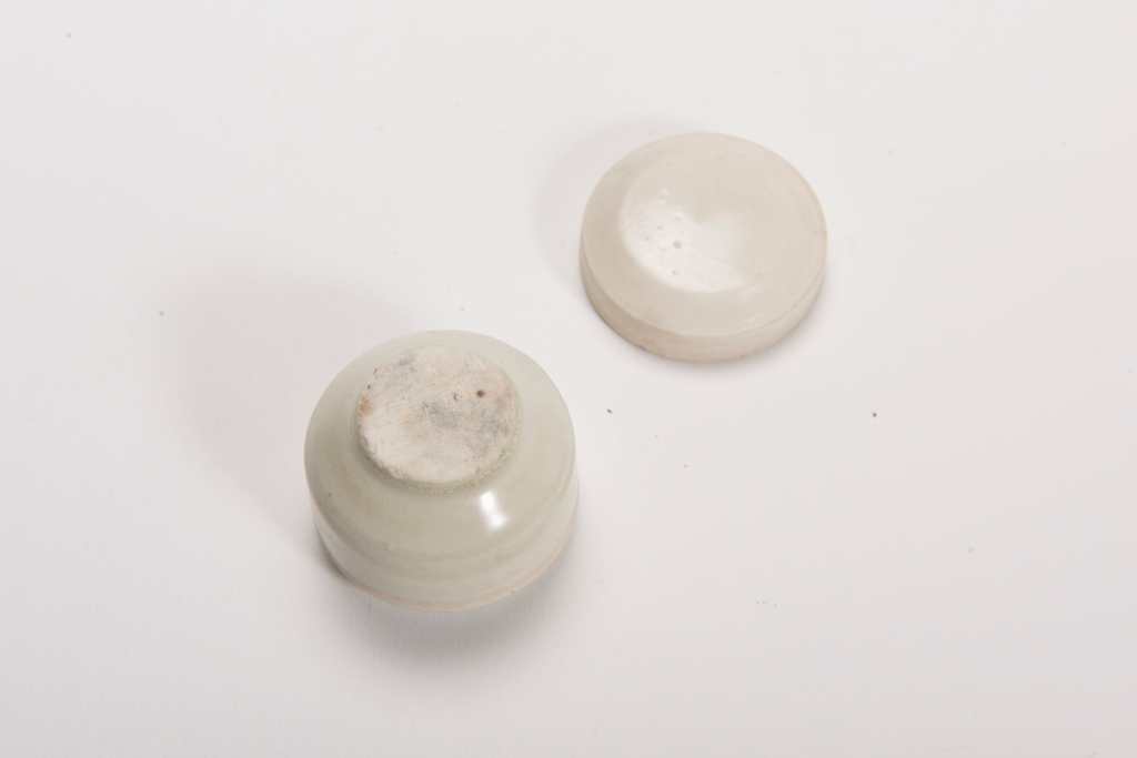 盒呈圓形,上下子母口扣合,直壁,蓋頂隆起,腹下內收,圈足。胎壁較厚,胎質堅硬。里外施白釉,釉色潔白,釉面瑩潤。