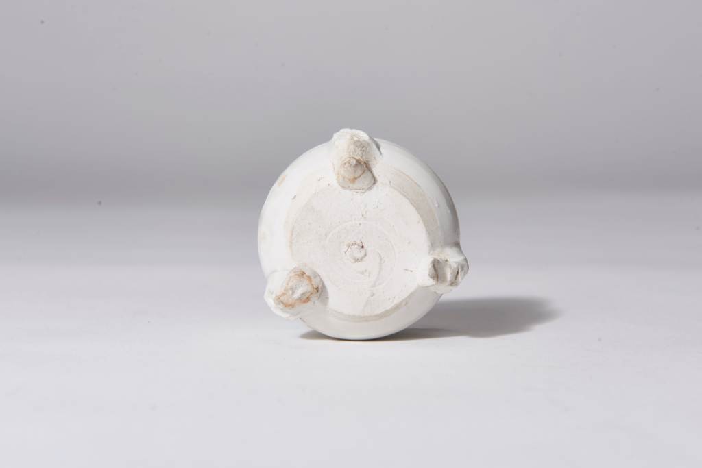 爐唇口,頸微束,溜肩,鼓腹,下承三獸足。通體施白釉,樸雅沉著,澄凈透明,釉至爐底,足尖無釉露胎,質地細密。整體造形玲瓏巧致,敦實可愛,樣式格外古樸,可作焚香用具、或陳設之用、或於掌中把玩,令人愛不釋手。