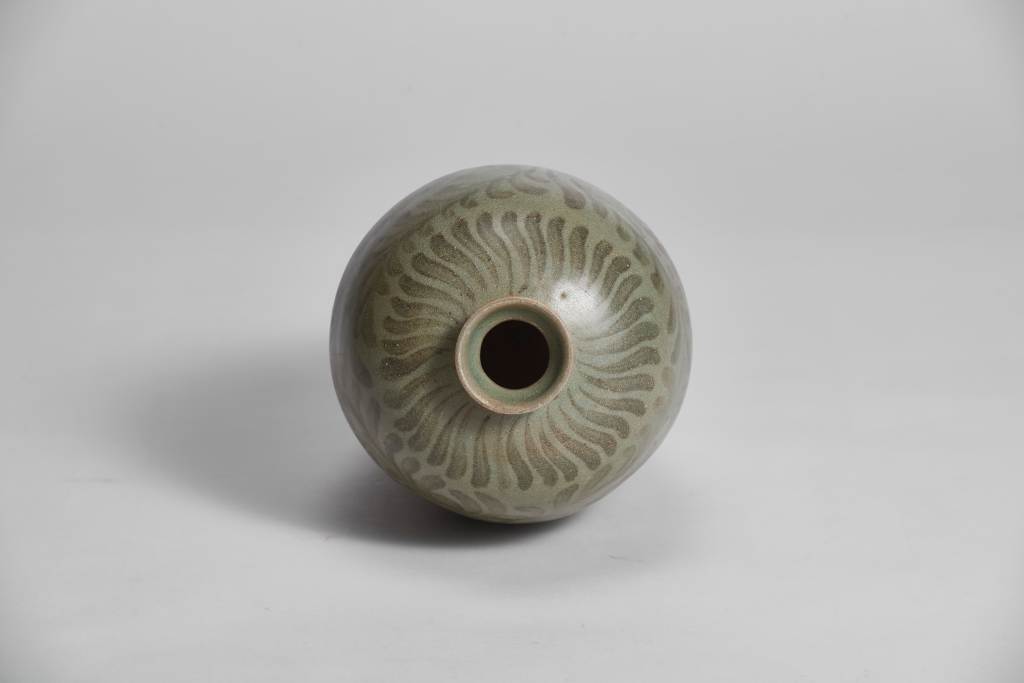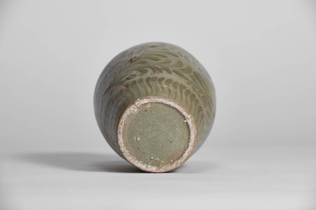 本品平口、斜頸、聳肩、圓腹、下身收窄,腹部瘦長,弧線微收,矮圈足。整器俊秀挺拔,以黑褐發色的氧化鐵為顏料描繪寶相花紋,肩底描繪花卉紋,筆觸流暢有力。