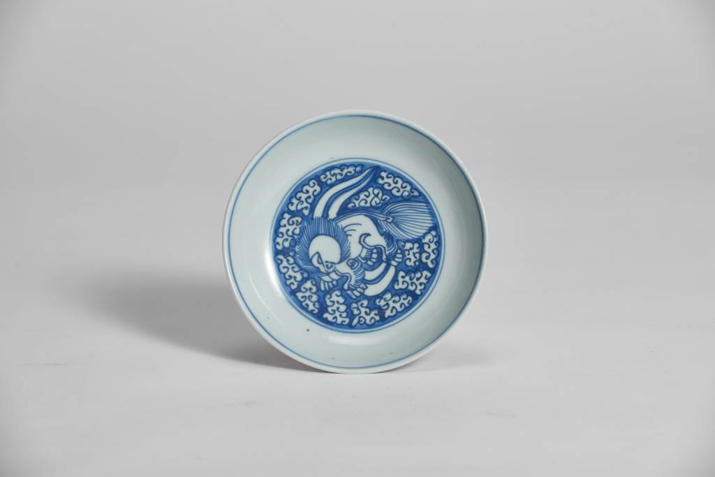 通體繪青花紋飾,內壁繪飾波濤紋;盤心繪獅子滾繡球紋飾,靈動活潑,全器構圖巧妙,線條流暢,青花發色深沈濃妍,為明代青花雋品。