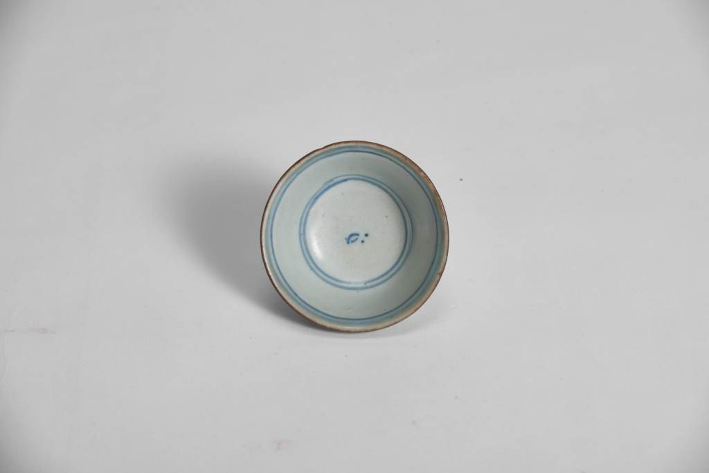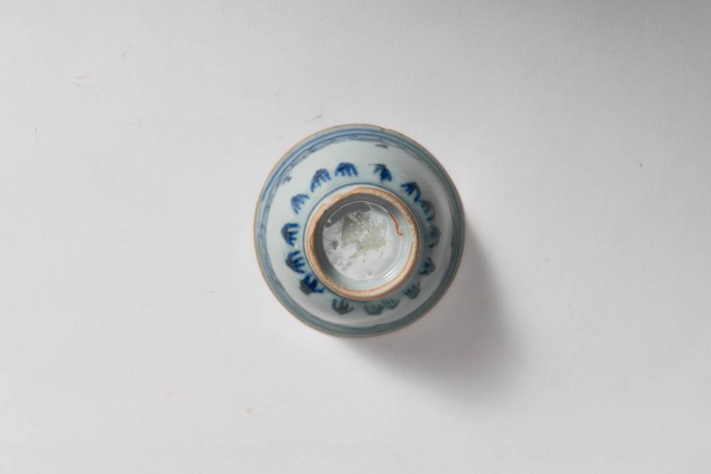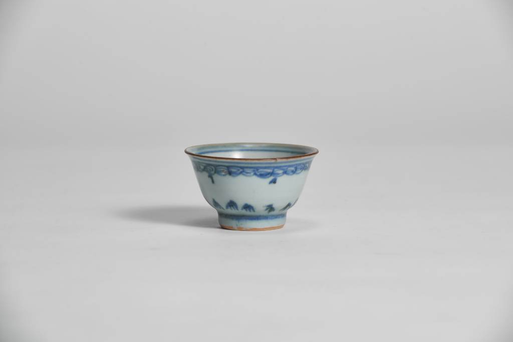 此杯敞口,深弧腹及底內收,下承圈足,胎體輕薄細膩,造型小巧雋秀。杯外壁以青花繪花卉紋,整體保存完好,胎釉發色皆為佳品。