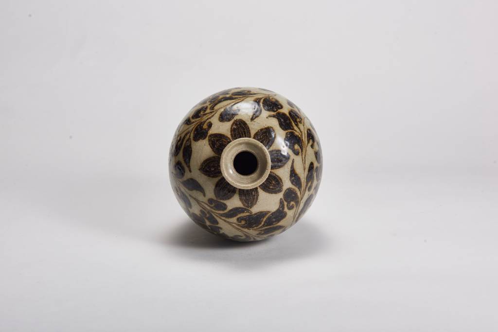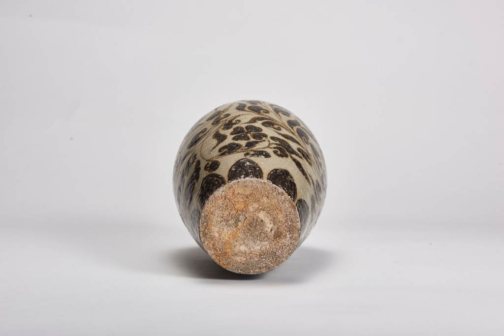 本品小口折沿,短頸廣肩,腹部瘦長,弧線微收,矮圈足。整器俊秀挺拔,胎質厚重堅致,以黑褐發色的氧化鐵為顏料描繪寶相花紋,肩底描繪蓮瓣紋,筆觸細膩精緻,風格端整秀麗,為鐵繪青瓷作品中的少見之作。