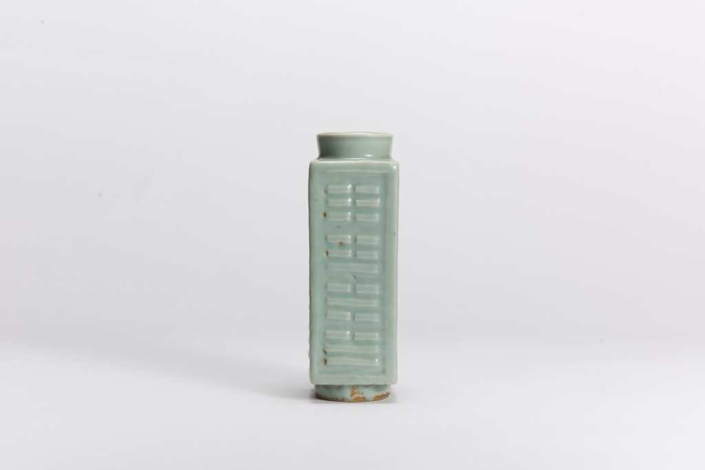 本品為唇口,短頸,平折肩,長方體腹 器身四面以凸起的八卦紋為裝飾 圈足形制端莊,胎體厚重 全器滿施青釉,釉色青翠如玉,深具古韻 琮式瓶天方地圓,為禮所制,傳世少見