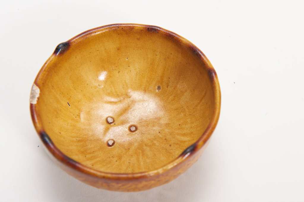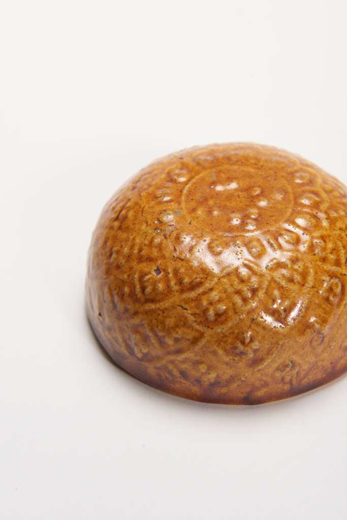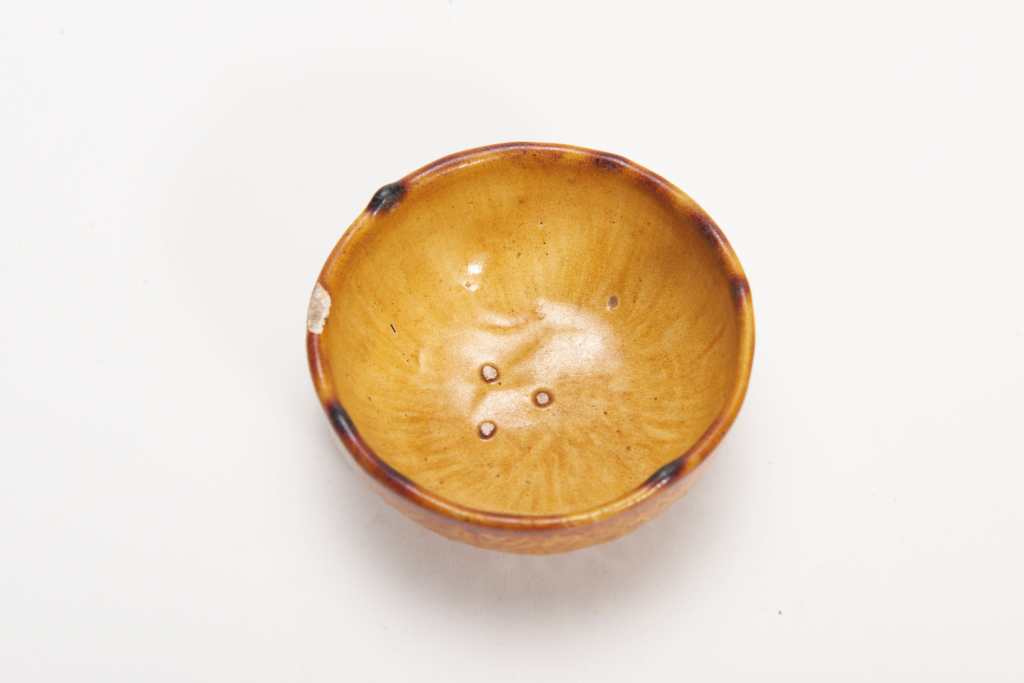 碗直口,弧腹斜收,外腹壁印蓮瓣紋,瓣脊外凸。施黃釉,釉層肥厚,釉面勻淨,質感溫潤。