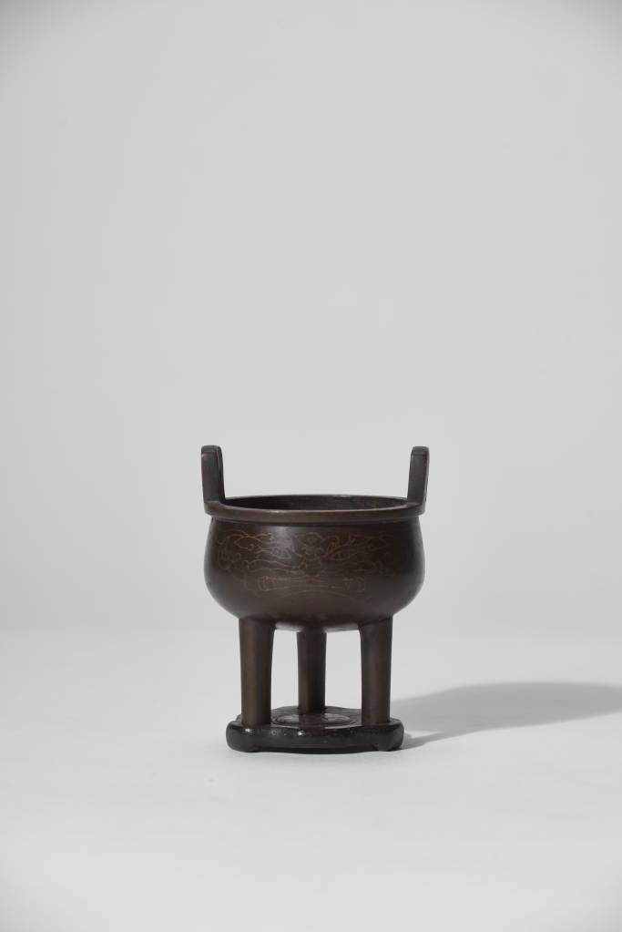 鼎形香爐帶雙直耳,腹部嵌銀絲飾饕餮紋,精工奇巧,三長足直立,文震亨在《長物志》卷七討論〈香爐〉的部分,提到「三代、秦、漢鼎 及官、哥、定窯、龍泉、宣窯,皆以備賞鑒,非日用」,清楚點明銅質及陶瓷器香爐的賞鑑性質。而如本件作品,應該也是在整個賞鑑風尚之下的當代作品