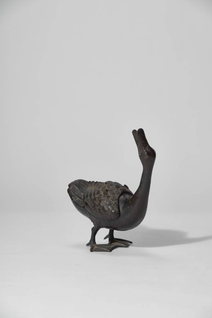 香薰為回首雁鴨造型,型制優美,應為明代十六世紀前期文物。銅胎,爐蓋與器身在腹部套合,香煙經由背上開口溢出。除了喙及足蹼之外,全身羽毛也製作的非常生動,鴨形薰爐實際上出現得很早,據考古資料,在漢代就已經有了。直至清代,依然可見它的身影。