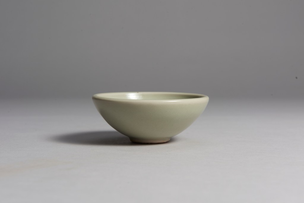 耀州窯瓷器到金代開始呈現月白釉,此盌為此時期典型釉色,釉水玻璃質感強。內外皆為青釉,器形為矮墩式盞。口沿略微內斂,圈足,深弧腹,整體造型端莊、古樸、規整、製作精良。