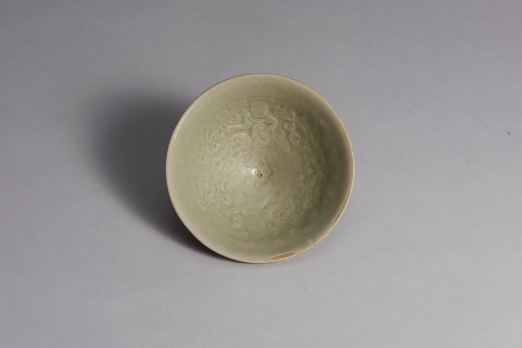 碗敞口,寬唇,深弧壁,圈足。里外施青釉。碗內刻嬰戲蓮花紋,一肥胖的嬰兒戲於三朵蓮花之間,兩手腕各戴一手鐲,憨態可掬。