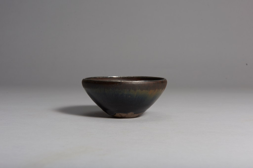 缽斂口,內折沿,弧壁,圈足,胎骨厚重,施罩黑釉,釉色濃稠烏黑,帶有流動性,器外壁施釉不及底,釉層上薄下厚,口沿呈現赭褐色「褐口邊」,外底邊有積釉流淌的垂釉痕跡,釉表帶黃色條縷絲紋,類似野兔毫毛,故宋人稱之為兔毫茶盞。